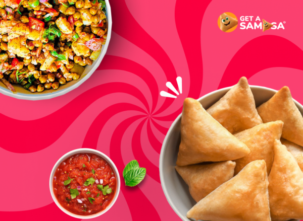 Spicy chana chaat packed into a crispy samosa — Chaat Madness! A burst of tang, spice, and pure desi fun in every bite.