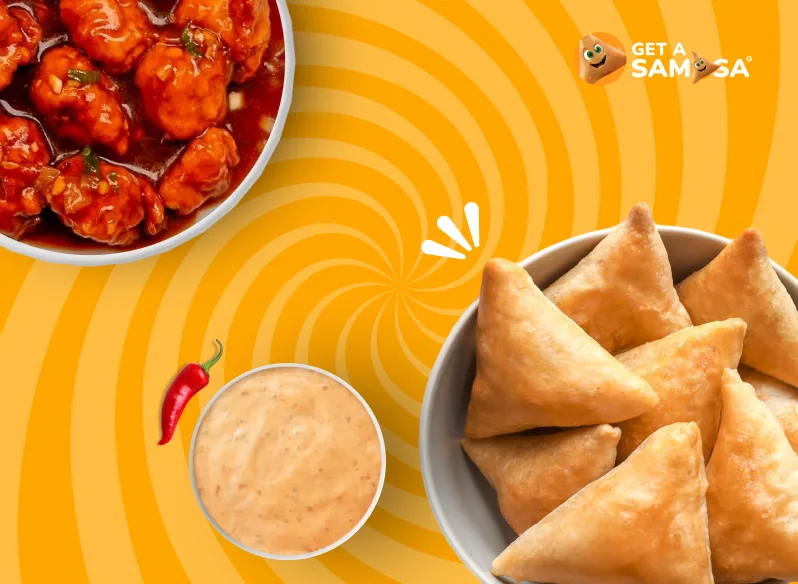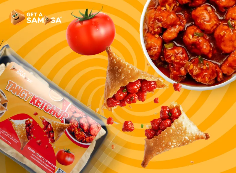 Chicken chunks in a tangy tomato sauce with a spicy twist, Tangy Ketchup! A bold, munchurian-style chicken samosa.